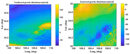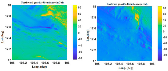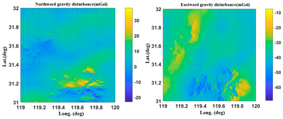Gravity disturbance error (Reproduced From Figures 2 and 3 at Zhu, Z.S.; Zhao, B.; Guo, Y.Y. Research on Gravity Vertical Deflection on Attitude of Position and Orientation System and Compensation Method. Aerosp. Sci. Technol. 2019, 85, 495–504. Copyright © 2019 Elsevier Masson SAS. All rights reserved.).