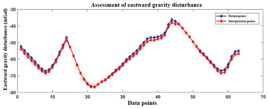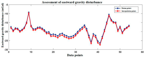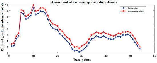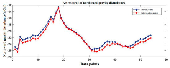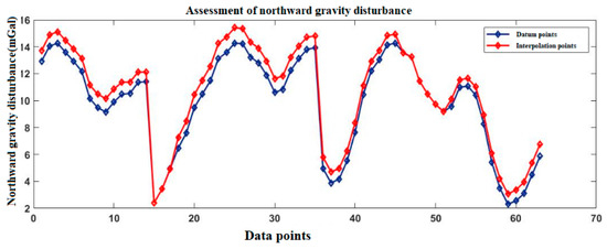 Figure 3 and Figure 4 show the gravity disturbance value at the selected interpolation point and the gravity disturbance value at the corresponding datum point; the gravity disturbance data evaluation at the interpolation point is shown in Table 3.