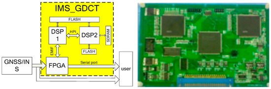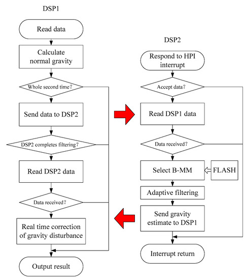 Considering the requirements of real-time and reliability, the device adopts the hardware structure of FPGA (Field Programmable Gate Array) + Dual DSP (Digital Signal Processing). According to the function, it can be divided into two parts: the data input and output module, and the data-processing module. The data input and output module takes FPGA as the core, which is responsible for collecting all information from the INS and interacting with user data. As for the data-processing module, it takes DSP as the core and applies a distributed Dual DSP parallel structure. DSP1 is the main processor, which can read the locked information from the INS, access to the internal high-precision gravity map data, perform the mathematical operations related to the calculation of inertial measurement/navigation gravity correction, and manage, coordinate and schedule the work process of the whole distributed processing unit. DSP2 is a slave processor, which performs data unpacking, data integrity detection, gravity disturbance compensation method calculation and other tasks. The data between DSP1 and DSP2 is transmitted at a high speed and parallels through the Host Port Interface (HPI). During the process of data transmission, DSP is not required to participate in and DSP solution is not interrupted.