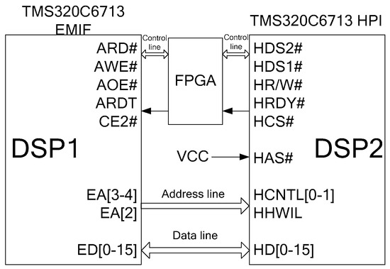 External memory interface (EMI) and host port interface (HPI) interface diagram of Dual Digital Signal Processing (DSP).