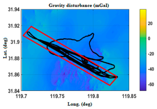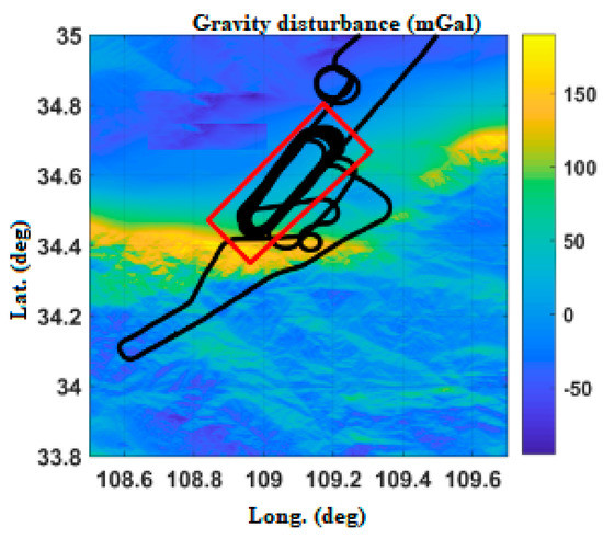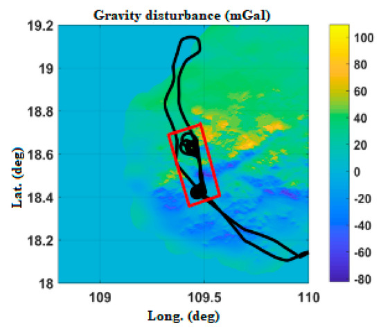 It can be seen from Formula (1) that the effect of gravity disturbance on the output of inertial measurement is mainly highlighted in the horizontal component, which mainly affects the attitude measurement accuracy of POS products. As shown in Table 1, the gravity disturbance of 25 mGal will result in a Pitch/Roll angle error of about 0.003° [9,14]. The variation range of is about ~200″ in north-south and of is about ~160″ in east-west [15]. Gravity disturbance has become the bottleneck of high-precision inertial measurement, and it is also the key technology with an urgent need to be developed for long endurance and high precision in INS [16,17].