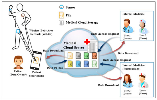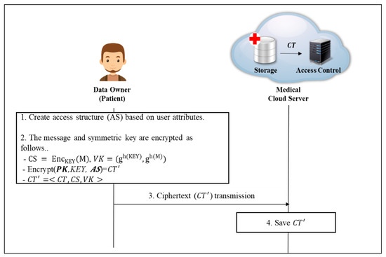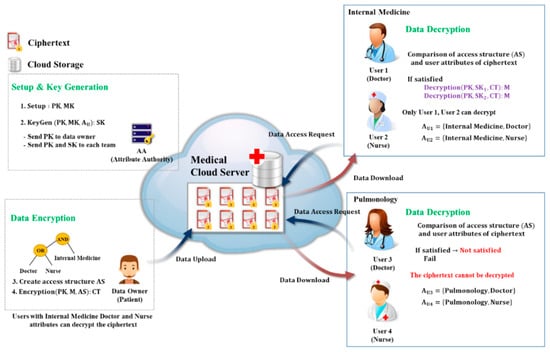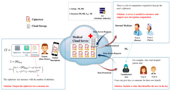 - Medical Cloud Server: Cloud servers consist largely of storage and access control (AC). Storage is where encrypted data is stored, and an AC server is a trusted server that supports outsourcing operations. The AC server role controls user access and processes part of the decryption operation after comparing the attributes of the access structure specified in the ciphertext with those of the user who requested the ciphertext. As a result, the decryption computations of the user is reduced, thereby increasing the efficiency of the user’s decryption operation.