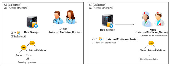 ABE performs encryption and decryption depending on user attributes and an access structure. ABE includes CP-ABE and KP-ABE. At the left of Figure 2 is the CP-ABE method [1,2]. The owner of the data creates an access structure with the attributes of the users who can access the data and creates a ciphertext using the public parameters, master key, and access structure. After, the data is encrypted, and it is transmitted to the cloud. Thereafter, users who want the data then access the cloud to receive the ciphertext, and compare their own attributes with those specified in the ciphertext’s access structure to decrypt the ciphertext. For example, if a user who wants to access the data has the [Internal Medicine] and [Doctor] attributes, as shown in Figure 2, the data owner creates and encrypts an access structure including the [Internal Medicine, Doctor] attributes. Then, only the users with the attributes matching the access structure can decrypt the ciphertext.