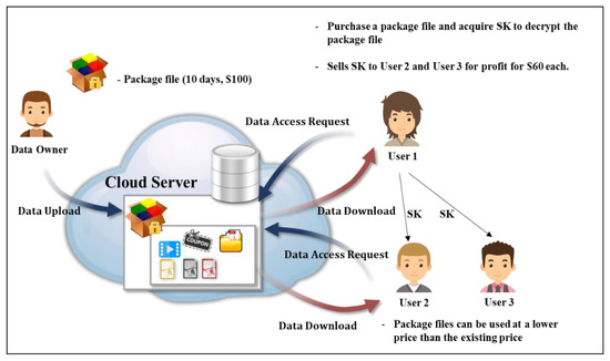 In existing CP-ABE methods, a user requests registration from the AA, and the AA generates and transmits a key employing user attributes to permit decryption. In this case, the secret key is a parameter operation that includes the user attribute value, and there is no value to identify the user. Thus, if the user maliciously distributes the key to a third party, that party can access the cloud and decrypt the data. Figure 4 shows a scenario where a package file worth $100 is placed for 10 days on the cloud server. User 1 purchases it and employs it for 10 days. If User 1 sells the key to Users 2 and 3 for $60 each, those users can also access the file and user 1 cannot be identified. The problem here is that there is a process in which the key is distributed, but above all, the problem is that the user who was issued the key cannot be known. This is a fundamental problem with CP-ABE. To solve this, as shown in Table 1, CP-ABE schemes that provide traceability to prevent key abuse have been proposed [5,6,7,8,9,10]. However, CP-ABE schemes that provide traceability can invade user privacy by exposing the users’ identifier values to the AA when the keys are issued, and thereby the anonymity of the users is reduced. Accordingly, this study proceeds in the direction of verifying the identity of the user through a tracking process when the key that is distributed is later misused while protecting the privacy of the users through anonymous IDs.