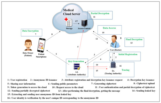 As shown in Figure 6, the participants in this proposed scheme consist of five objects: data owner, cloud server (storage, access control (AC)), tracing authority (TA), attribute authority (AA), and user. A detailed description of the object role and protocol flow proposed in this paper are below.