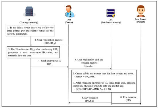- User registration and key issuance phase: The user registers with the TA before receiving the key from the AA. The TA registers its own unique identifier and ID values, creates an anonymous , and sends it to the user (shown in steps 1–2 in Figure 6).