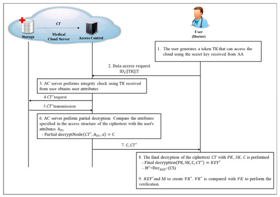 In this phase, the user accesses the cloud, receives the ciphertext, and then decrypts it. The decryption step consists of two steps: partial decoding on the AC server and final decoding by the user (shown in Figure 9).