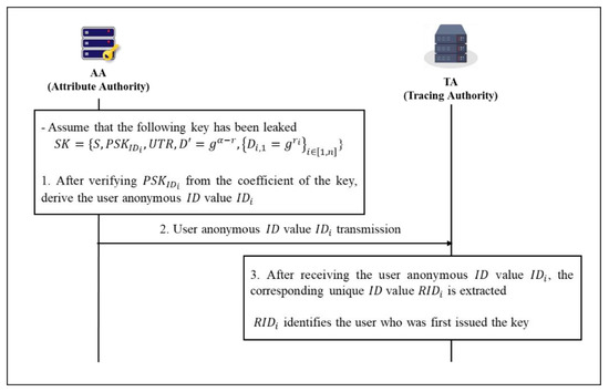 Step 1. AA verifies in the parameters of the distributed key and extracts the user’s anonymous ID value . Thereafter, the user’s anonymous ID value is transmitted to the tracing authority agency TA.