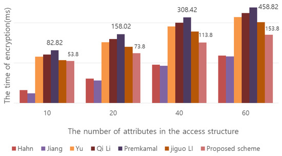 - Cloud storage space efficiency: In existing CP-ABE methods, when the ciphertext is generated, the size of the ciphertext increases in proportion to the number of attributes specified in the access policy, thus wasting storage space. In particular, in the Qi Li scheme, the size of the ciphertext increases with the number of attributes. In the proposed scheme, the number of attributes specified in the access policy is represented as a single number by performing a separate operation = , which results in a constant-size ciphertext. As a result, as opposed to existing CP-ABE methods, the proposed scheme generates a ciphertext of a certain size, not proportional to the number of attributes specified when generating the ciphertext. The wasted cloud storage space can be used efficiently. However, only the size of the ciphertext is constant. The amount of computation required for encryption varies depending on the number of attributes.