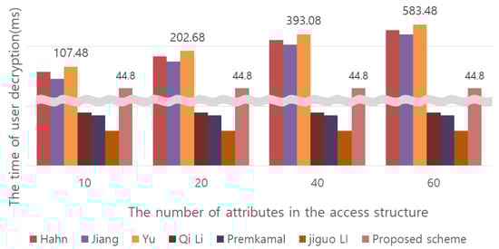 - Efficiency of computation: In conventional CP-ABE methods, when decrypting the user receives the ciphertext and decrypts it. Accordingly, the amount of computation for the use is proportional to the size of the ciphertext. This proposed scheme performs partial decoding by including an AC server that supports outsourcing. As the result of partial decryption by the AC server, the user receives the C and the ciphertext and proceeds to the final decryption, so the message M can be obtained. By using the AC server for outsourcing, the computational efficiency can be increased by reducing the amount of computation required for the user. As shown in Table 4, this proposed scheme has more user decryption computations than the Qi Li and Premkamal, Jiguo Li schemes among the CP-ABE methods that support an outsourcing server. This is because most of the decryption operations are performed on the server, so the more users there are, the more computations the server processes. However, in the Premkamal scheme and Jiguo Li scheme, when the user distributes the key to someone, the distributed key can be used for access by unauthorized users. At this time, if the distributed key is misused, the user who originally issued the key cannot be tracked. In other words, the aforementioned key abuse problem arises. Traceability is provided in the qi Li system, but personal privacy issues may arise because the server that issued the key knows the user’s information. Our proposed scheme solves the problem of key abuse by tracking the user who was issued the key for the first time through the leaked key and provides user anonymity.