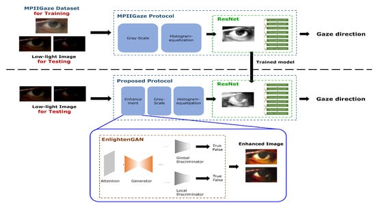 - Could the proposed approach improve the performance of gaze estimation under low illumination conditions? Through this question, we validate the feasibility of the proposed approach which adopts GAN-based image enhancement in the loop. To this end, we conducted experiments to compare the performance of gaze estimation for low-light images between the conventional gaze estimation protocol and the proposed approach.