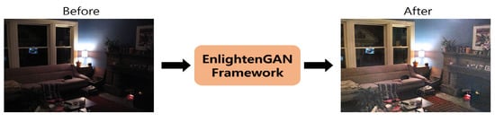 - Jiang, Y.; Gong, X.; Liu, D.; Cheng, Y.; Fang, C.; Shen, X.; Yang, J.; Zhou, P.; Wang, Z. EnlightenGAN: Deep Light Enhancement without Paired Supervision. arXiv 2019, arXiv:1906.06972. [Google Scholar]