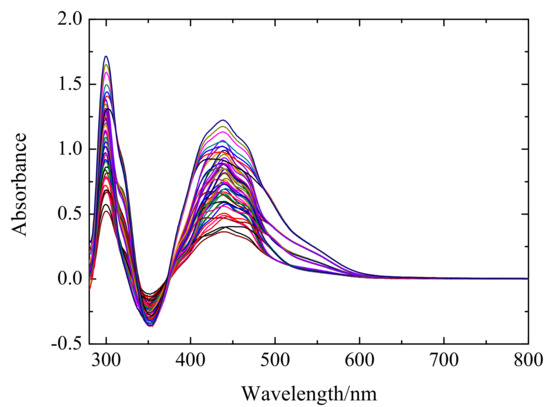 In this study, 49 groups of mixed solutions are analyzed. Figure 1 shows the original spectra of the 49 mixed ion solutions. The measured UV–vis spectrum wavelength ranges from 280 nm to 800 nm with 1 nm scanning resolution. Each sample is scanned three times and the averaged spectrum is obtained for calculation. Among them, the concentration range of Zn(II) is between 10 mg/L and 70 mg/L and the concentrations of Cu(II), Co(II), and Ni(II) all range from 0.2 mg/L to 1.4 mg/L. The concentration of Zn(II), Cu(II), Co(II), and Ni(II) in the solutions are shown in Table 1. Figure 2 is the spectra of single ion solution of Zn(II), Cu(II), Co(II), and Ni(II), which exhibits that the peaks of ions are adjacent to each other. This is because the competitive reaction between Zn(II) and other impurity metal ions aggravates the spectrum overlapping and masking. Meanwhile, the peak shape and movement tendency of ions are similar due to their resemble chemical properties. Besides, a negative peak occurs mainly because the absorbance value of Zn(II) complex in the measured solution is less than of the reagent blank at 320–380 nm. A large amount of noise appear at 280–300 nm and 300–400 nm mainly because of the high absorbance of the reference solution, making the spectrum nonlinear at these ranges. Therefore, the traditional calibration method based on the full spectrum can hardly achieve a high detection accuracy.