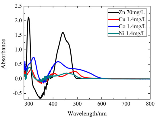 The main metal ions in the hydrometallurgy wastewater of Zhuzhou Smelter Company are Zn(II), Cu(II), Co(II), and Ni(II), in which the concentration of Zn(II) is 20–250 times that of the other metal ions. Huge difference of ion concentrations can lead to inconsistent intensity of spectral and severe masking problems. Hence, it is extremely significant to select appropriate experimental reagents to ensure the precision of simultaneous determination for the multiple ions. The reagents and their optimized dosage are as follows: 0.4% Nitroso R salt chromogenic agent solution: 2.5 mL; HAc-NaAc buffer solution: pH = 5.5, 5 mL. The concentrations of zinc standard solutions are 1 g/L. Copper, cobalt, and nickel standard solutions are all 12.5 mg/L. All reagents are of analytical grade and added in a 25 mL colorimetric tube. The specific operation procedure of the experiment is as follows: In the 25 mL colorimetric tube, add 5.0 mL HAc-NaAc buffer solution. Add zinc standard solution and proper amount of copper, cobalt, nickel ion standard solution. Add 2.5 mL 0.40% Nitroso R salt chromogenic solution, shake well to make the chromogenic reaction fully react. Add distilled water to make the volume up to 25 mL. Prepare reagent blank. Adjust the instrument to zero. Place the sample in a 1 cm quartz cuvette, and use the reagent blank as a reference.