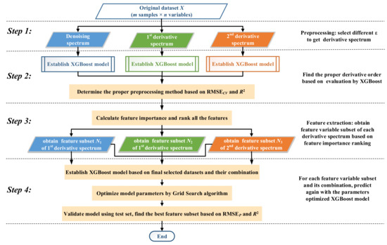 In view of the merits of SPSE and XGBoost, in this paper, they are integrated to establish a novel calibration model, shorted as SPSE-XGBoost. The focus of this approach is to explore the benefits of combining feature subsets of multi-order derivative spectrum and, meanwhile, introduce the ensemble XGBoost algorithm as key model in feature selection and prediction of metal ion concentrations such as zinc, copper, cobalt, and nickel. To assess the quality of SPSE-XGBoost model, the root mean square error (RMSE), the coefficient of determination (), the mean absolute percentage error (MAPE), and the maximum absolute percentage error (MaxAPE) are utilized as the main evaluation criteria in the proposed approach. Smaller RMSE, MAPE, and MaxAPE represent better model precision. Figure 4 illustrates the flow chart of the proposed SPSE-XGBoost model that is comprised of the following four steps.