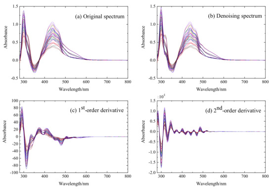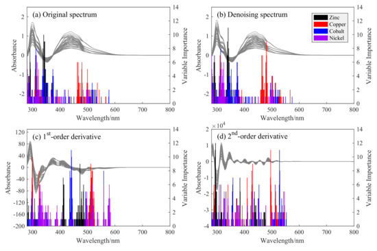 The samples were firstly divided into a training set (39 samples) and a test set (10 samples) using the Kennard-Stone algorithm [36]. To highlight the characteristic information of each ion, different singularly perturbation parameter is selected in the SPSE to get the denoising spectrum and the first-order and second-order derivative spectra. To obtain the best preprocessing results, the in our work were set as 0.007 for denoising spectrum, 0.013 for first-order spectrum, and 0.016 for second-order spectrum, respectively. It can be seen from Figure 5 that subtle changes in the original spectrum is obviously reinforced after pretreatment, highlighting the ionic difference. The denoising spectrum does not make significant difference with the original spectrum in the shape. The absorbance and resolution are greatly enhanced in the derivative spectra, which reasonably expands the data space and thus provides abundant features for variables selection.