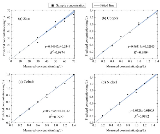 The scatter points in Figure 7 illustrate the comparison of actual concentration and predicted concentration in the test set. The black lines are the fitted lines of actual and predicted concentration scatter points. The blue shaded areas stand for the gap between the 1:1 lines and the fitted lines. When the fitted line is closer to the 1:1 line, the blue shaded area is smaller, indicating a better correlation between the prediction result and actual concentration. As exhibited, the fitted lines of each ion closely approach to the 1:1 lines and the values of each ion are higher than 0.987, suggesting that the proposed method has favorable accuracy and promising effect in detecting the concentrations of zinc, copper, cobalt, and nickel ions in zinc sulfate solution.