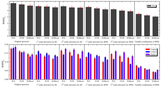 To further verify the performance of the proposed model, different derivatives pretreatment methods, such as Savitzky-Golay (SG) derivative algorithm and traditional modeling methods (CARS-PLS, UVE-LS-SVM), are also carried out and compared in Figure 8. Note that CARS-PLS and UVE-LS-SVM are shortened as PLS and SVM in the figure, respectively. All the methods are conducted 10 times to obtain the statistical results. Only the variable combination method of SPSE uses subset combination of characteristic variables, while the other methods are all based on the full spectral variables. From Figure 8, the performances of the different algorithms are distinct. For the single preprocessing methods, the original spectral data almost have the highest RMSE due to the noise and masking problems in the raw spectrum. The exceptions are the first-order derivative for cobalt and the second-order derivative for nickel, which have been interpreted in Section 3.1. The derivative spectra using SPSE always achieve lower RMSE than the corresponding SG, indicating that SPSE is superior to SG. For the modeling methods, the XGBoost outperforms the other two traditional calibration methods as shown in the figure. It is worth mentioning that the combination of variables has a significant effect on model promotion and yields the lowest RMSE, signifying the best prediction ability of SPSE-XGBoost in general.