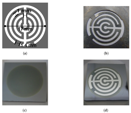 A geometric pattern was designed to deposit electrodes, make electrical contact, and obtain the sensor device. The pattern was reproduced in a metallic mask, which was used during a metal deposition process. Aluminium (Sigma Aldrich (St. Louis, MO, USA), 99.999% purity) was deposited by sublimation using a JEOL JEE-420 vacuum evaporator. Each electrode consisted of two concentric no-closed rings of 1 mm width, connected by a line of the same width. Both electrodes were deposited horizontally, on the porous material. The separation between the electrodes was 1 mm, except at the end of the rings, at the corners (the separation was 1.4 mm). Figure 1a shows the design of the geometric pattern with its dimensions, and Figure 1b is a photograph of the mask used to deposit the electrodes. The light parts was where the aluminium went through to deposit, whereas the dark parts covered the porous silicon to avoid the deposit. The area of the porous silicon was 2.746 cm.