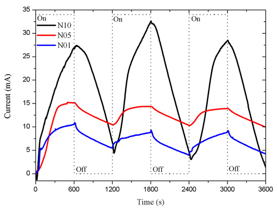 The results of the n-type porous sensors are shown in Figure 3. The N10 sensor (type-n with a 10 m porous layer thickness) presented a more intense response than the N05 and N01 sensors (type-n with 1 and 5 m porous layer thickness). The dead time was approximately 30 s in all cases, both in the exposure and recovery periods. The response intensity increased as the thickness of the porous layer increased, showing a proportional relation.