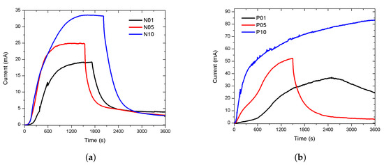 Finally, the sensors with a lower response intensity, N01 and P10, for each type of conductivity, were selected to be measured in a lower ambient vapor pressure (less EtOH carried into the chamber). The EtOH was at 0 C, the calculated vapour pressure was 11.76 mmHg, while the temperature of the chamber remained at 27 C, in the darkness at atmospheric pressure. The results of the sensors N01 and P10 are shown in Figure 6a,b, the responses are labeled adding a letter, A or B, to distinguish if the vapor pressure of the EtOH was 58.73 or 11.76 mmHg, respectively. Both sensors had a less intense response than the previous, but they have a similar shape. A deeper study of the sensitivity correlated with the change on the thickness of the porous layer is necessary to determinate the limit and the behavior of the sensitivity. The sensitivity of the porous silicon (with a constant thickness of the porous layer) to organic vapours has been studied by different authors [27,28,29].