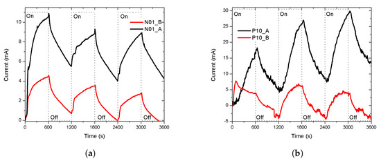 The sensitivity of the response at a lower vapour pressure (11.76 mmHg). The temperature of the chamber remained at 27 °C (a) Porous sensor N01. The response of the sensor at 58.73 mmHg, labeled as N01_A, had a similar shape than its response at 11.76 mmHg, labeled as N01_B, but was less intense. (b) Porous sensor P01. The first cycle (first 20 min) of the response of the sensor at 58.73 mmHg, labeled as P10_A, was different than its response at 11.76 mmHg, labeled as P10_B, and less intense. The current, in the cycles, was under 0 mA because the baseline was subtracted from the original response so that the intensity of the responses started at zero and can be compared.