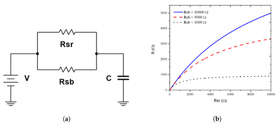 Electrical model. (a) The RC circuit used to obtain the experimental response where R was the parallel of Rsr with Rsb. (b) R versus Rsr with fixed Rsb of 1, 5, and 10 kΩ.