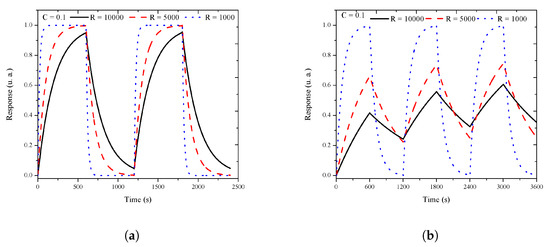 The RC circuit response. (a) Normalized response R vs. time with C = 0.1 F and R = 1, 5, and 10 kΩ. (b) Three cycles of 20 min, with 10 min for the exposure period and 10 for the recovery period.