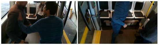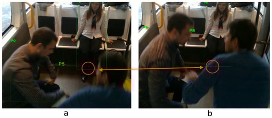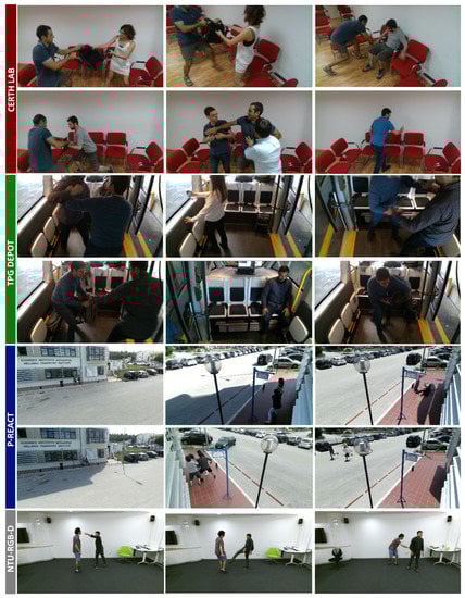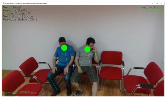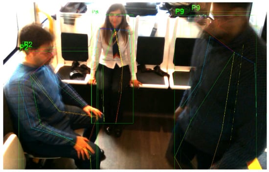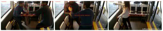 In this paper, five datasets were used: (a) data simulated in lab, (b) data captured from Geneva Public Transport (TPG) shuttles, (c) from petty criminality diminution through search and analysis in multi-source video capturing and archiving platform (P-REACT) [] project, (d) the NTU-RGB-D [] dataset by ROSE lab, and (e) the UCSD Anomaly Detection dataset []. An overview of those datasets is illustrated in Figure 1. As an initial approach, we conducted several recordings on our labs at the Centre of Research and Technology Hellas Information Technologies Institute (CERTH/ITI) facilities, simulating the shuttle environment as close as possible. In this session, 13 different scenarios were simulated using two different camera perspectives for each one. The dataset contains 6650 frames that, in conjunction with some augmentation techniques described later, were sufficient to train the LSTM Classification via pose estimation experiment and obtain decent results. The second data capture was performed in TPG facilities from indoor environment of the shuttle as a real-environment in Geneva. We obtained 29 video sequences with 46,127 frames, demonstrating real conditions in an autonomous vehicle at the TPG depots. The merging of these two datasets led to substantially better results and allowed to perform more experiments. We performed additional evaluation using samples from NTU-RGB (without depth information) dataset, which helped to access the performance on unknown data and fine tune the model to generalize. In addition, samples from P-REACT and UCSD datasets were used to verify the results and implement the spatiotemporal autoencoder. Most of the collected data were annotated by VLabel, a cross-platform utility specifically developed for this purpose (Figure 2).