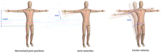 The feature vector consists of features described in Table 2 and depicted in Figure 7, such as a direct concatenation of joints positions, the average skeleton height for normalizing joint positions, velocity of the joints, and the body’s center.
