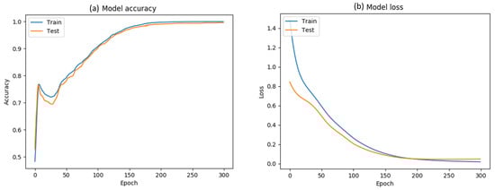 The evaluation performance of our model is depicted in Figure 9. We split the data with a 70-15-15 train/validation/test ratio and after 300 epochs, our model achieves a 99.6% accuracy. The time cost for feature extraction and classification is less than 50 ms per frame for the classifier, since the model is relative shallow.
