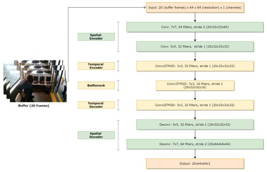 In order to learn the regular events in training data, we introduce a spatiotemporal autoencoder. Our model consists of (a) a spatial autoencoder in order to obtain spatial features and (b) a temporal encoder-decoder to learn temporal features of the encoded spatial features. In particular, the spatial autoencoder consists of an encoder and a decoder that are composed of two convolutional and transpose convolutional layers, respectively, whereas the temporal encoder is comprised of three convolutional LSTM layers, as depicted in Figure 10. Convolutional layers perform excellent in object detection, whilst the LSTM model is applied for learning sequences and modeling time-series and has shown superior performance in applications such as speech translation and handwriting recognition.