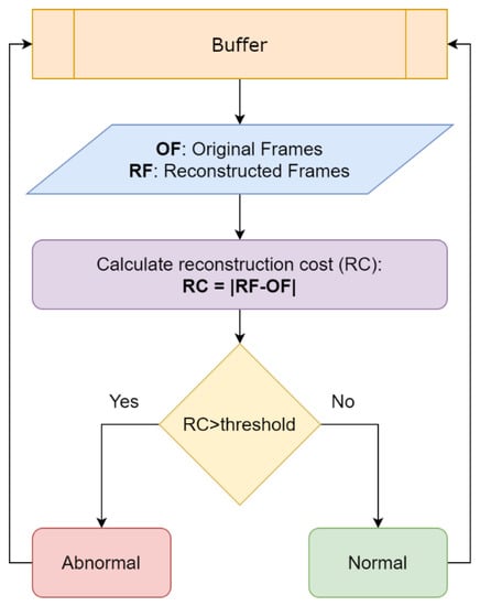 Decision flow: A high reconstruction cost between OF and RF indicates an abnormal event.
