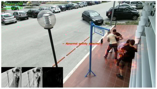 Mahadevan et al. [] proposed an anomaly detection framework appropriate for crowded scenes. According to their research, they were able to detect anomalies in clustered scenes using joint modeling of scene dynamics and appearance, as well as abilities of discovering spatial and temporal abnormalities. The normal crowd behavioral model is based on combining dynamic textures, whereas outliers in it are identified as anomalies. Spatial anomalies are handled using discriminant saliency, while temporal anomalies are associated to low probabilistic events. For the experimental evaluation they used crowded scenes as a dataset, utilizing 100 video sequences and five well-defined abnormality categories. Avilés et al. [] presented a coarse-fine convolutional method for human activity recognition using smartphone sensors. Ordóñez et al. [] have also proposed techniques for wearable human activity recognition using multimodal deep convolutional and LSTM recurrent neural networks. Another interesting study from Sabokrou et al. [] presented an effective framework appropriate for anomaly detection and localization in video streams. Using both temporal data and fully convolutional neural networks (FCNs), they proposed a pre-trained supervised FCN, that later on transfers into an unsupervised FCN, capable of detecting global anomalies. By investigating the cascaded detection resulting in computation complexities reduction, the model offers high accuracy and speed. This FCN-based architecture can be applied in videos to represent features and detect cascaded outliers. Yuan et al. [] proposed a structural context descriptor (SCD) that describes the crowd individual, initially introducing the potential energy function of particles’ interforce in solid-state physics for intuitive contextual cueing of vision. So as to compute the crowd SCD variation successfully, they designed a robust multi-object tracker, employing the incremental analytical ability of the 3D discrete cosine transform (DCT) to associate the targets in different frames. With the proposed method, the abnormality is localized with the online spatiotemporal analysis of the crowd SCD variation. Fernando et al. presented an LSTM framework that fits for both predicting human trajectories and detecting abnormal events using deterministic models called soft attention models, which are trained using back-propagation []. Ravanbakhsh et al. [] combine semantic information (inherited from existing CNN models) with low-level optical-flow, in order to measure local abnormality. Wei et al. [] achieved a more robust human action recognition. Firstly, they combined video images with simultaneously captured inertial signals, using a video camera and a wearable inertial sensor within a fusion framework, and then turned them into 3D video and 2D inertial images. Finally, once these images are fed as inputs into a 3D convolutional neural network and a 2D convolutional neural network, respectively, the model is able to perform action recognition. Other approaches focused on the transport domain, such as [,,,], rely on facial expressions and behavior, gaze and eye tracking for detecting emotions, stress, anxiety, and panic. Although effective, those methods add another layer of complexity to our solution, as they require high resolution facial images which subsequently introduce privacy issues.