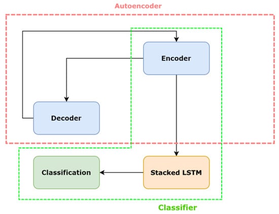 The training process of the new experiment consists of 3 stages, as Figure 16 illustrates: At first, the autoencoder model (encoder + decoder) is being trained in an unsupervised manner to learn regularity. In the second stage, the encoder weights are transferred to the hybrid model. The new hybrid model consists of an additional stacked LSTM layer, which acts as a classifier. The encoder‘s layers are marked as non-trainable. Finally, we perform supervised training only on the LSTM Classifier.