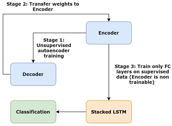 The three stage pipeline of the hybrid training procedure consists of an initial unsupervised training, followed by transfer learning and retraining of the stacked LSTM Classifier.