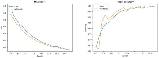 We trained the hybrid model for 20 epochs, using an 64/16/20 train/validation/test ratio. The loss and the accuracy are depicted in Figure 17. The final model accuracy is 98%.