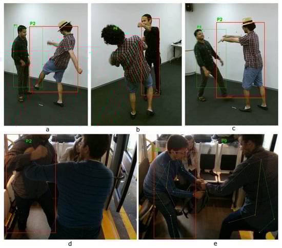 Evaluation on test data: (a–c) Abnormal event detection (violence/passengers are fighting) using different camera angles from the NTU-RGB dataset. (d,e) Detection of fighting/bag-snatch real-world scenarios inside the shuttle.