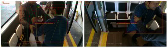 We tested our pose classification approach on the NTU RGB+D dataset [] (Figure 18a–c) and on the TPG dataset captured by CERTH inside the AV’s shuttle (Figure 18d,e). In the images, there are various debugging layers enabled, such as skeleton points, lines, tracker ID, and bounding boxes of each detection. The predicted result is marked as green, when the classifier indicates it as “normal” and red when “abnormal”, correspondingly. So far, we did not include NTU dataset samples in our training set, so it is safe to assume that our model can generalize across different people, view angles, and events. Figure 19, Figure 20 and Figure 21 depict the aforementioned conditions and use cases.
