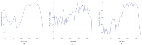Regularity curves (top-left) with a bag-snatching scenario using three preprocessing methods: (a) MOG2 background subtraction, (b) frame subtraction (absdiff), (c) Farneback optical flow. All methods managed to detect the abnormal events in 80th and 250th frame. MOG2 performed better in terms of stability and achieved more consistent results on passenger boarding and disembarking.