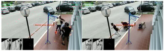 In order to visualize the predictions, we provide the preprocessed input frame for the current moment at the bottom-left. The frame is resized from 64 × 64 and grayscale and a mask overlay is obscuring the out-of-interest areas (road). At the right next to the input frame, the resized output of our model is shown. The third mini-frame demonstrates only the significant differences between the input and the output frames with white pixels which is then merged above the original frame for demonstration purposes. Figure 23 illustrates the predicted pixel-level anomalies of an outdoor fighting scenario in a simulated bus stop.