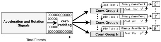 As CNNs learn convolution filters that react to specific features, these maximum and minimum activation values are correlated with specific motions. To ensure that the convolution filters learn and capture discriminating dynamics for every action class, different sets of filter banks were independently learned through multiple binary classification problems and grouped convolutions. From this process, illustrated in Figure 1, N different feature vectors, , were created based on the discriminating filters learned for each of the N different actions. Additionally, this process also resulted in N different binary classifiers.