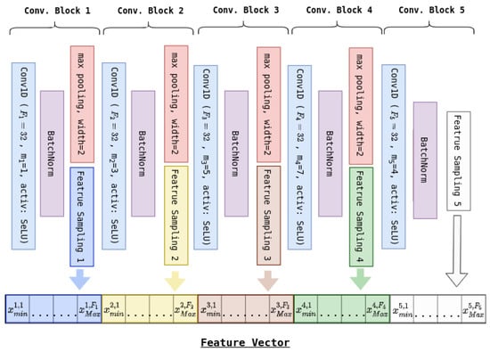 Rather then connecting the output of the last convolution block to a classifier, as was done in previous 1D-CNN based works [,,,], the proposed method instead achieves high-level reasoning (inference and learning) by connecting to a classifier the maximum and minimum values of each dimension of each time series generated throughout the network. Equivalently, this concept can be regarded as generating a feature vector, , by sampling elements of the different time series as such: