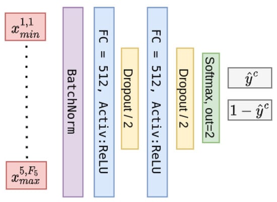 where and refer to the mean and variance of the elements of the kth dimension computed on the examples of the mini-batch, B; is an arbitrarily small constant used for numerical stability; and finally, and are parameters learned in the optimization process in order to restore the representation power of the network []. It can be deduced from Equation (5) that the width of the max pooling operator is 2; hence, the length of the time series is halved after each convolution block (i.e., ).