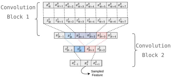 In order to illustrate this process, let us take a look at Figure 4, which takes the previous example one convolution block deeper. For both convolution blocks, the first line refers to the block’s input; the following is the result of the convolution layer; and the third is the result of the pooling layer. In order to simplify the analysis, the time step vectors only have one dimension, and batch normalization is omitted as it has no influence on the temporal traceability. As the second block’s convolution filter has a width of three (i.e., ), if a feature is sampled from the second time series, , with a relative position index of t, the corresponding dynamic consequently occurred between the th and the th time steps of the original signal.