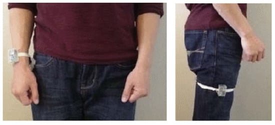 Although it provides RGB, depth and skeleton streams, our experiments were conducted only on the inertial sensor signals, which were acquired from a single IMU worn on the right wrist for Actions 1 through 21 and on the right tight for Actions 22 through 27, as displayed in Figure 5. For all our experiments, the evaluation protocol suggested in the original UTD-MHAD paper [] was followed, where odd subjects are for training and evens for evaluation, except in Section 5.2, which will additionally provide an assessment of the performances through a leave-one-out k-fold cross-validation protocol. In all cases, the experiments were performed using the PyTorch deep learning framework with stochastic gradient descent as the optimizer and a batch size of 16. The learning rate was initialized at 0.01 and decayed 1% per epoch. Weights were initialized using the Xavier method, and the bias of the classifier was initialized using a Gaussian distribution of mean 0 and variance 1.