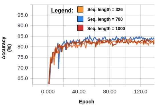 Moreover, it was also observed that with our hierarchical method, it was possible to train the model using sequences of a certain length and proceed to classify sequences of a different length, which is impossible with the other CNN approaches. As a matter of fact, the parameters learned at the 100th epoch of the model trained with the sequence extended to 700 time frames (see Figure 6) resulted in an accuracy of 84.88%, which was also reproduced regardless of the testing examples being zero-padded up to 326 or 1000 time frames.