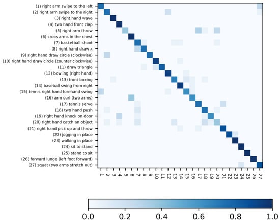 With our method, we obtained a maximal accuracy score of 85.35%, which resulted in the confusion matrix provided by Figure 7. As we can see, the performances were better on actions for which the inertial sensor was placed on the thigh rather than on the wrist.