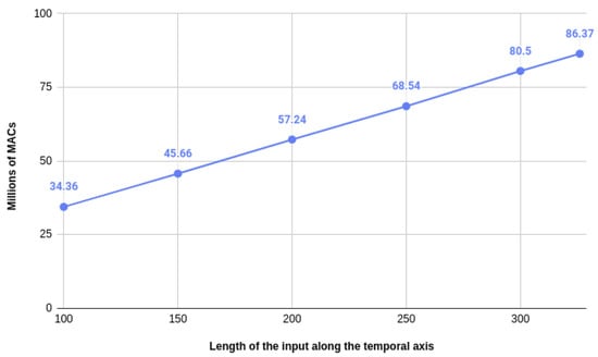 As a matter of fact, the number of operations needed by our model is directly correlated to the normalized length of the input sequence. As we can see in Figure 8, the relation is linear and is equal to 86.37 million multiply and accumulate (MAC) operations when the normalized length is equal to 326.