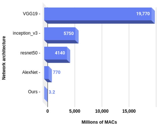 Therefore, the number of operations and parameters can be divided by 27 in order to be integrated into a simple device only recognizing one action. In that case, the number of parameters would only be 343,830, which only takes about 1.4 MB of memory if the parameters are represented with single precision floating-point numbers, as was the case in our experiments. In the case of the number of operations, it comes down to about 3.2 million MACs. As MACs account for two floating point operations (one multiplication and one addition), if a processing unit has a throughput of 1 operation per clock cycle, a processing speed of only 3.2 MHz would be necessary in order to run our model under 1 s. As many inexpensive microcontrollers offer sufficient performances, this proves that our method could easily be embedded into smart devices. Finally, comparing our method with some of the most popular CNN architectures regarding the number of computations, on Figure 10 and the number of parameters on Figure 11, we can appreciate once more how hardware-friendly our method really is.